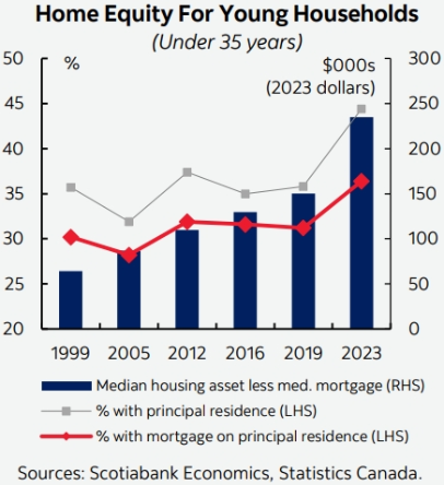 Canada young household ownership rate (see chart below from Scotiabank Economics): “Contrary to much hype, an increasing share of young households have a stake in housing markets. For those under 35, primary residence asset ownership jumped almost 9 ppts to 44.4% in 2023. A greater share of younger households also acquired secondary real estate assets, whereas the general population saw a pullback.”