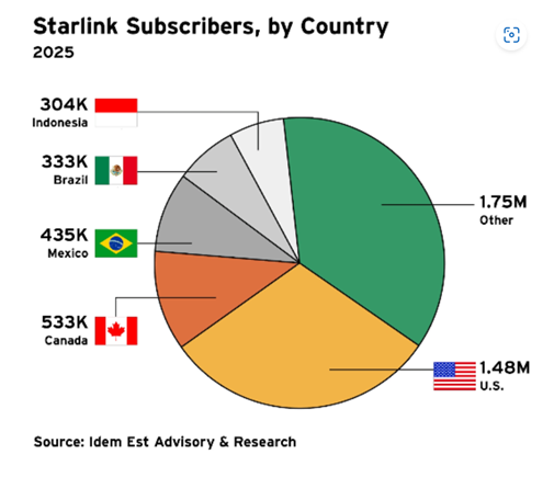 Starlink subscribers (see chart to the left from Prof G Markets): “Ontario pulled the plug on a $100 million contract with Starlink, citing newly imposed U.S. tariffs on Canadian imports. For Starlink, the cancellation is a rounding error. Its revenue doubled from $4 billion in 2023 to $8 billion in 2024. The bigger picture? Canada and Mexico are Starlink’s largest markets outside the U.S.”