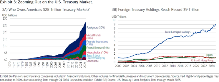 U.S. Treasury selling concerns (see charts below): “Concerns of meaningful foreign selling may be overblown. Zooming out in Exhibit 3A, while foreigners remain the largest holder of the U.S. Treasury market, their share of the total has technically been in a steady decline for years. It peaked in 2008, in fact, at 57% of $5.8 trillion. Since then, while foreign holdings have more than doubled, debt held by the public has nearly quintupled—i.e., demand for Treasurys has broadened out over the past decade. Among today’s diverse pool of buyers: mutual funds (18%), financial institutions (15%), the Fed (14%), and households (10%). Meanwhile, for all the recent attention on anti-U.S. sentiment in markets, zoom out a second time with Exhibit 3B: Foreign holdings of U.S. Treasurys hit an all-time high of $9 trillion in March 2025, the last available month of data. That’s $233 billion higher than February and nearly a trillion higher than just a year ago.”