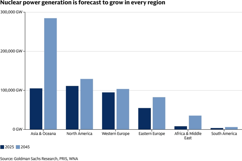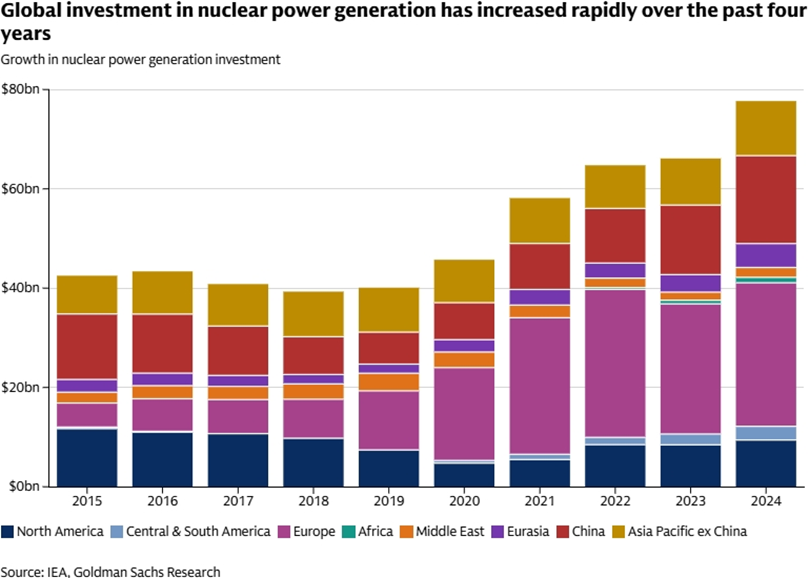 Going nuclear (see chart below from Goldman Sachs): “The world’s nuclear reactor fleet has been aging rapidly due to underinvestment and a lack of interest in the technology. After decades of underinvestment, the median nuclear reactor is around 32 years old. Now, however, conditions appear to be primed for the construction of nuclear power plants to accelerate. At the most recent COP29 climate summit in November 2024, 31 countries pledged to triple the world's global nuclear generation by 2050, alongside 140 nuclear industry companies and 14 large financial institutions.”
