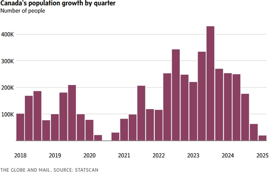 Canada’s population growth slows to a crawl (see chart below from The Globe and Mail): “Between Jan. 1 and April 1, 2025, the overall population grew by just 20,107 people to roughly 41.55 million. At 0.05 per cent, this was the weakest quarter for growth since the height of the COVID-19 pandemic. From 2021 to 2024, the population jumped by an average of 217,000 people a quarter, a historic period for growth that raised widespread concerns about access to housing and health care – and eventually forced the federal government to implement new restrictions on migration, particularly for temporary residents.”