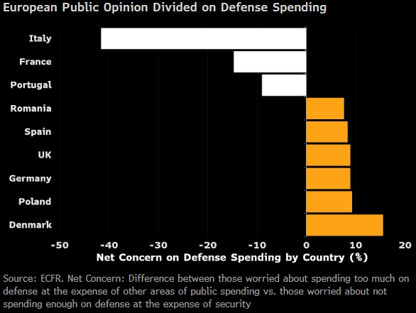 Does European defense spending have public support? (see chart below from Bloomberg): “NATO leaders aim to approve a core defense spending target of 3.5% of GDP, plus 1.5% for broader outlays on June 25. But even if that goal is finally agreed upon, will they all follow through? We think it is unlikely. Spain’s last-minute resistance has exposed the reality: while governments may endorse the 5% target to avoid angering Trump, some view it as unrealistic and counterproductive—and not all will be willing to deliver on it. EU member states’ support will hinge on perceptions of geopolitical risk and domestic political priorities, which vary widely across the bloc. In major NATO members like France and Italy, many voters are more concerned about overspending than underspending. In contrast, sentiment in parts of Eastern and Northern Europe leans the other way, revealing divergent public views on the urgency of military investment. This highlights the political work still required for EU leaders to build public support for these initiatives.”