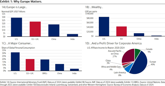 Why Europe matters to global finance (see charts below): “One, home to a population of more than 500 million, the European Union (EU+U.K.) remains one of the largest economies in the world. In fact, the EU lags only the U.S. when it comes to gross domestic output, measured in nominal U.S. dollars. EU GDP in aggregate (including the U.K.) totaled $23 trillion in 2024, versus $29.2 trillion in the U.S. and $18.7 trillion in China (Exhibit 1A).”
