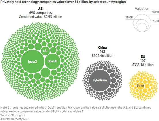 Venture capital is a wealth-making machine that is rooted deeply in US culture (see chart below from the Wall Street Journal): On the other hand, a risk-averse business culture and complex regulations have stifled innovation in Europe. (By the way, the US venture capital market is partly funded by global investors. In part, this is where the trade surplus money goes – so… it benefits the US again. Cheap t-shirts, Tech billionaires and lots of off-putting politics - -somehow it all works!)