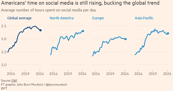 There is one notable exception to this promising international trend: North America, where consumption of social media’s diet of extreme rhetoric, engagement bait and slop continues to climb. By 2024, it had reached levels 15 per cent higher than Europe.”