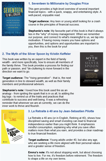 This year’s summer reading list, curated by my dear colleagues Stephanie Dean and Emma Li Lai Wah of RBC Wealth Management, Financial Literacy, features a thoughtful selection of titles to help clients and families strengthen their financial management skills and confidence. Whether you’re relaxing lakeside or in the comfort of your own backyard, it’s the perfect season to read, recharge, and expand your knowledge.