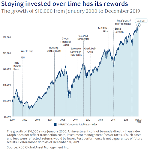 They may want to “get out” until things “calm down” but history has proven that timing that moment when to get back in is virtually impossible to get it absolutely right and the financial implications of missing just a few days of a market recovery can have a long term impact on your portfolio returns. It is important for everyone to understand that day-to-day market fluctuations will likely have little impact on your long-term investment objectives if you stay the course. Over the long-term, markets have always moved ahead. As you can see in this chart of the TSX total return index, prepared by RBC Global Asset Management, there are often events that cause dramatic fluctuations and extreme volatility, but the trend is always upwards when we review the long-term picture.