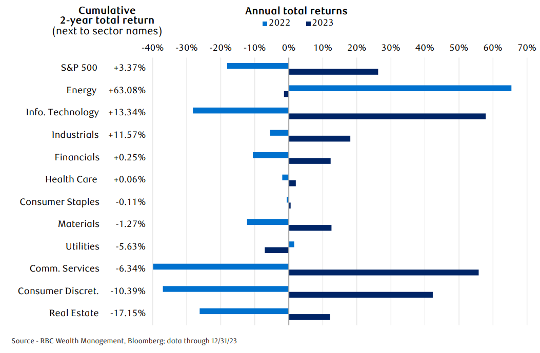 Today’s charts clearly illustrate that 2023 was largely a reversal of poor 2022 performance. Equity returns in 2024 will mainly depend on whether the U.S. economy succumbs to recession or achieves a much-coveted soft landing.
