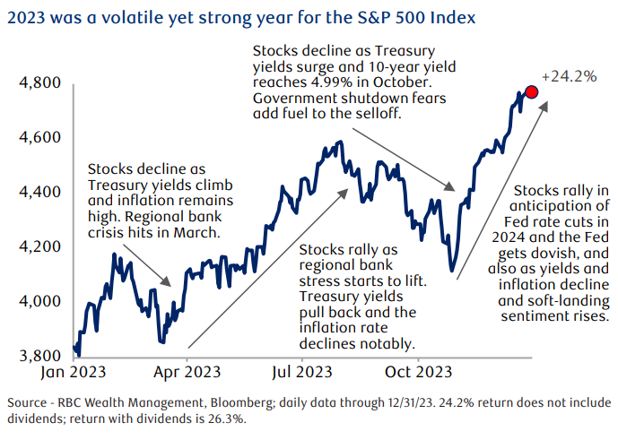 Consumer inflation dropped from 7.5 % at the start of the year to 3.1 % in November. Treasury yields surged mid-year with the 10-year yield peaking at 4.99 % in October, but it quickly fell back to 3.88 % by year end—just slightly above where it started the year.