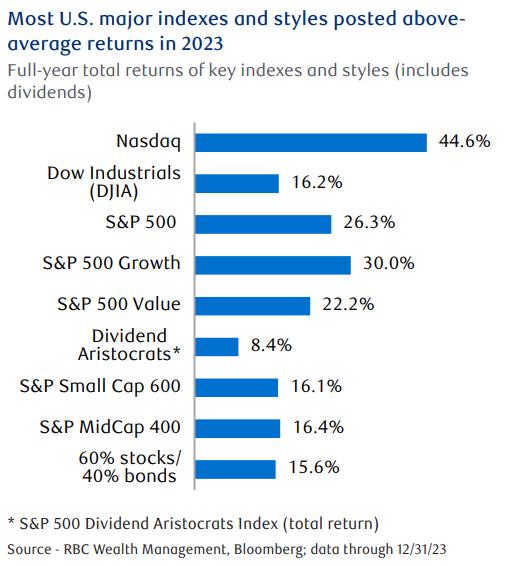 Not only did other large-cap sectors participate, but small-cap and mid-cap indexes also rallied strongly in late 2023.
