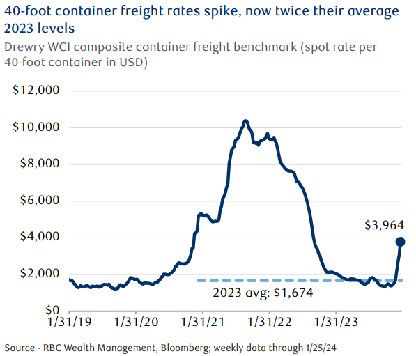 As a result of these disruptions, particularly the attacks in the Suez Canal area, spot shipping costs have been on the rise this year.