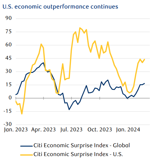 Projections from the Atlanta Fed’s GDPNow model suggest U.S. real GDP could expand by roughly 3 % quarter-over-quarter in Q1 2024, in line with its 3 % average growth rate in the second half of 2023 and meaningfully above consensus expectations of 0.1 % for the eurozone, 0.5 % for Canada and Japan, and 1.3 % for China. Much of this divergence can be attributed to variations in global economies’ sensitivity to interest rates and global trade conditions.
