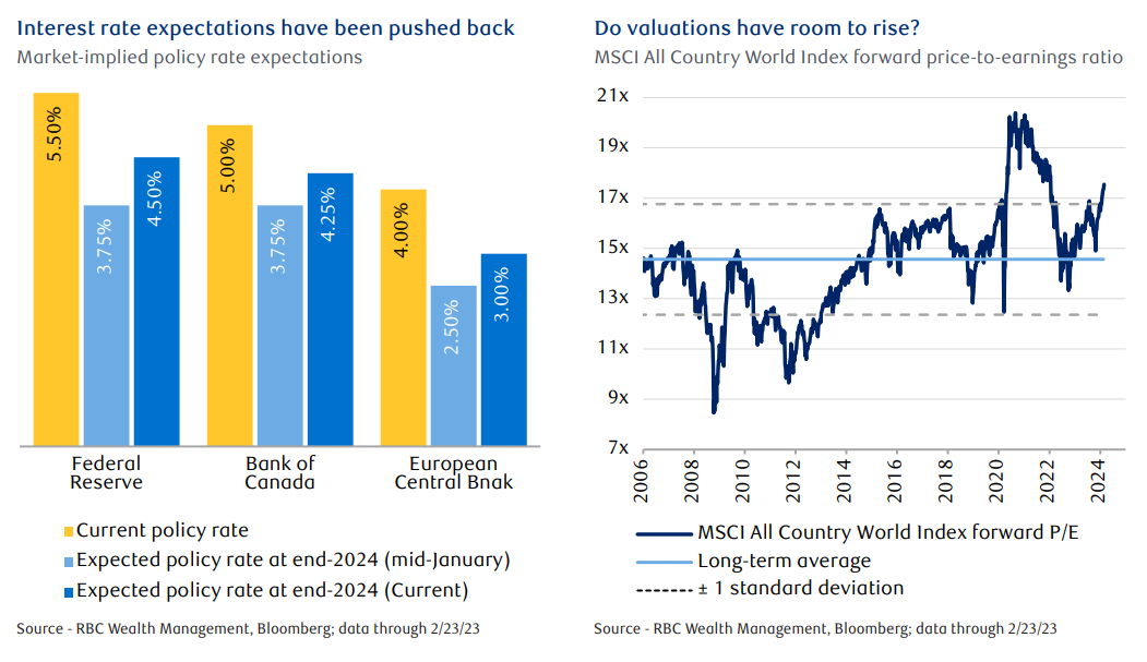 The world economy is navigating a landscape marked by an evolving mix of resilience and challenges. But according to current Bloomberg consensus expectations, 2024 should be a better year than 2023, with 7.5 % earnings growth forecasted for the MSCI All Country World Index. An expanding economy should allow corporate profits to rise over the coming quarters and support equity markets—although we would note that the sharp rally since last October, and the attendant higher valuations, may have anticipated this sanguine outlook.