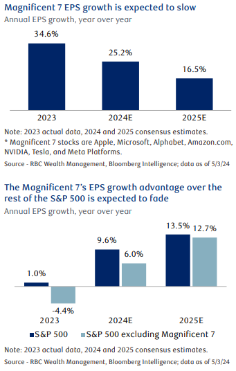 Later this year and next, the Mag 7 narrative could shift. Mag 7 earnings growth is forecast to decline meaningfully from 2023 to 2025, as the middle chart shows. This is due to difficult year-over-year comparisons and the law of large numbers. The bigger and more mature a company gets, the harder it is to deliver dramatic earnings growth year after year.