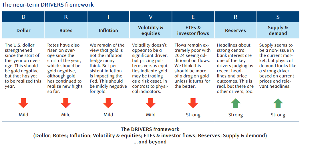 Gold prices have pushed past your Q2 2024 high scenario forecast of US$2,282 per ounce. What is required in your view for gold to retrace back to your Q2 2024 middle scenario of US$2,068 per ounce?