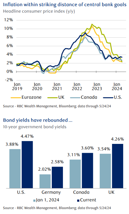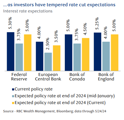 Bloomberg estimates show earnings for the MSCI All-Country World Index to increase by approximately 8% this year. Meanwhile, renewed inflation volatility has led markets to push back the timing and amount of potential central bank rate cuts this year.
