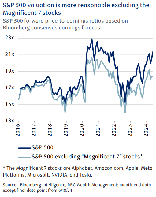 Bloomberg Intelligence points out that the valuation gap between the S&P 500 and S&P 500 ex-Magnificent 7 stocks is abnormally high at about 1.8 standard deviations above the mean. While currently not a problem, we are moving too close for comfort to the 2.0 standard deviation level that can be considered as excessive.