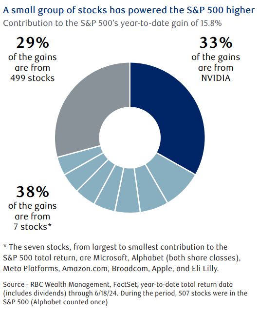 - AI chipmaker NVIDIA represents 33 % of the S&P 500’s year-to-date gain.
