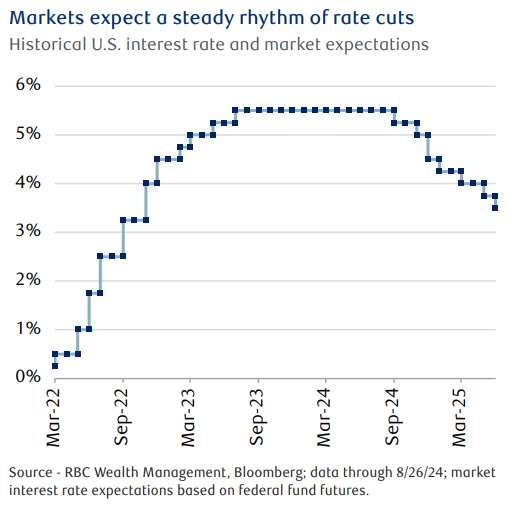 Accordingly, markets widely expect the Fed to deliver a 25 basis point (bps) cut in September and have priced in another roughly 175 bps of cuts through June 2025, which would lower the top end of the policy rate to 3.50% from 5.50% over the next 10 months (chart below).