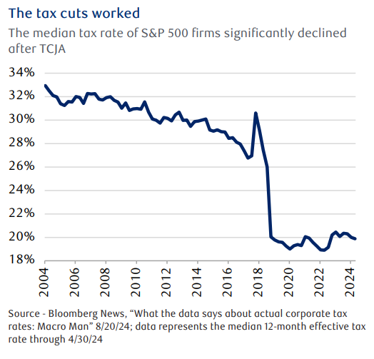 A Bloomberg study found, “Over the long run there has been essentially zero correlation between the effective corporate tax rate and the performance of the S&P 500…”