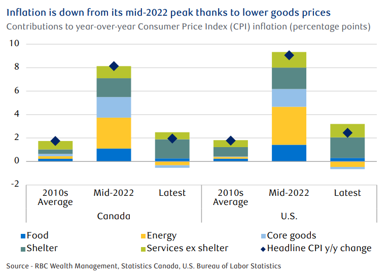 Shelter inflation is another source of ongoing price pressure thanks to tight rental and housing markets. In the U.S., rent and owner’s equivalent rent (what a homeowner could charge to rent out their home) lagged rising market rents. In Canada, still-rising rents, and higher mortgage interest costs are keeping upward pressure on shelter inflation.