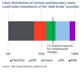 Reforming the debt brake may no longer be off-limits, particularly if the three traditional parties (CDU/CSU, SDP, and the Greens) achieve a two-thirds majority, as predicted by current polls.