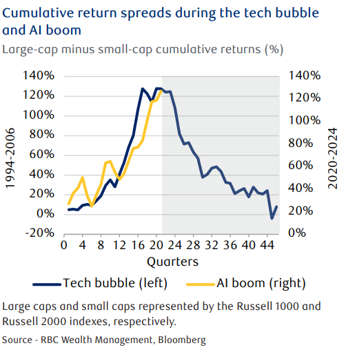 Tailwinds to small-cap stocks closing the gap to large include extremely elevated consensus earnings expectations for large caps (particularly amongst AI-related names), election risks fading.