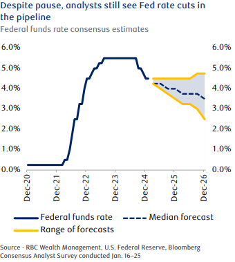 t indicates, a wide range of views amid elevated uncertainty still exist as consensus expectations as of Jan. 25—which should at least partly reflect the potential impact of policy changes from the new administration—still show further rate cuts could be forthcoming.
