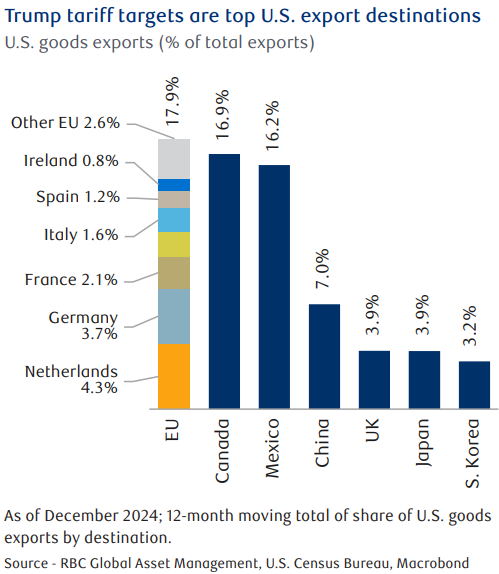 The European Union (EU) is finding itself in the crosshairs of a trade dispute with the United States. RBC Global Asset Management Chief Economist Eric Lascelles points out that although no individual European country is among its three largest trading partners, collectively the EU is the largest consumer of U.S. products and, at the same time, maintains a trade surplus with the U.S.— meaning the region exports even more than it imports.