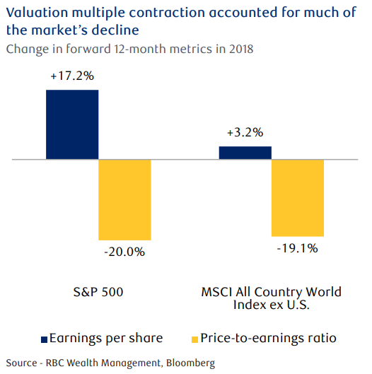 By the end of 2018, global stocks had declined by 11.2% in U.S. dollar terms, with the S&P 500 faring somewhat better, down 6.2%, while global ex.-U.S. equities slumped by 16.4%.