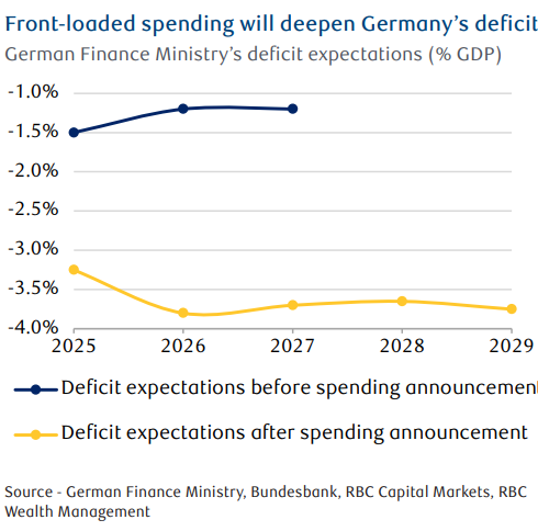 The German government is front-loading its special infrastructure fund, with around €58 billion by 2026, alongside some €25 billion in annual defense spending.