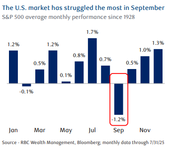 The S&P 500 is up 30 % since the tariff scare low in April and 10 % year to date. Since 1928, the S&P 500 has declined an average of 1.2 % in September, underperforming all other months.