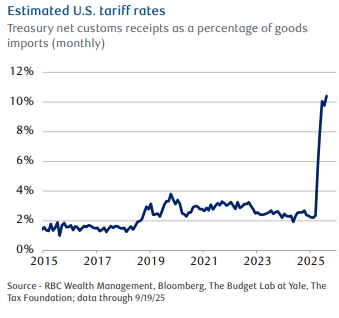 Customs duty collections suggest that, as of August 2025, the average tariff rate was closer to 10.5 %, well below the headline estimates.