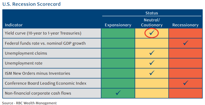 The U.S. Recession Scorecard created and maintained by our investment committee at RBC has historically been a very useful tool in its ability to decipher the state of the U.S. Economy.