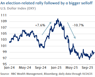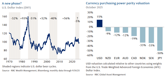 Even after this year’s depreciation, RBC Global Asset Management estimates that the U.S. dollar remains notably overvalued relative to major peers. Although valuations have limited sway on short-term market moves, they tend to revert to long-term trends.