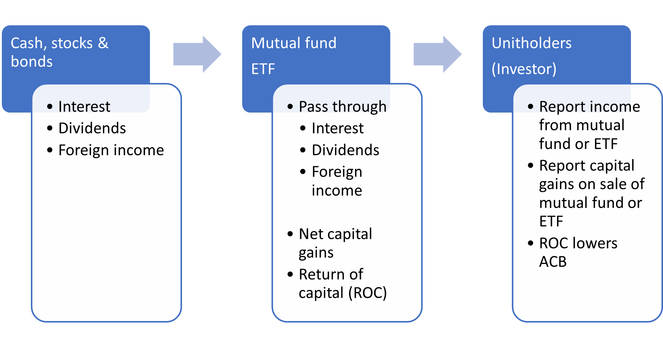 We previously discussed how investment income is taxed in our article Maximizing After-Tax Wealth. Many Canadians, however, invest in various types of investment funds so how in the world do you figure out how taxes are affecting your investment performance? Well, we can start high level at the structure of these investment funds. Most mutual funds and exchange-traded funds (ETFs) are set up as investment trusts. In a trust, all income must flow through to the ultimate beneficiaries of the trust. If it doesn’t, the trust will be subject to the highest marginal tax rate. This means a mutual fund or ETF distribute all the dividends, interest, or realized capital gains from its holdings (stocks, bonds, other funds, etc.) to its unitholders (you) who pay tax on the income. This is particularly important for realized capital gains – even if you did not sell anything directly, you may need to pay taxes based on the holdings sold within the fund. Figure 1 shows the flow of income from holdings through a mutual fund or ETF. Essentially, you receive the income and pay tax on the income as if you owned each holding within the fund which could be stocks, bonds, or another fund. Note we are not covering the differences between mutual funds and ETFs here but the mechanics of income and tax are the same.
