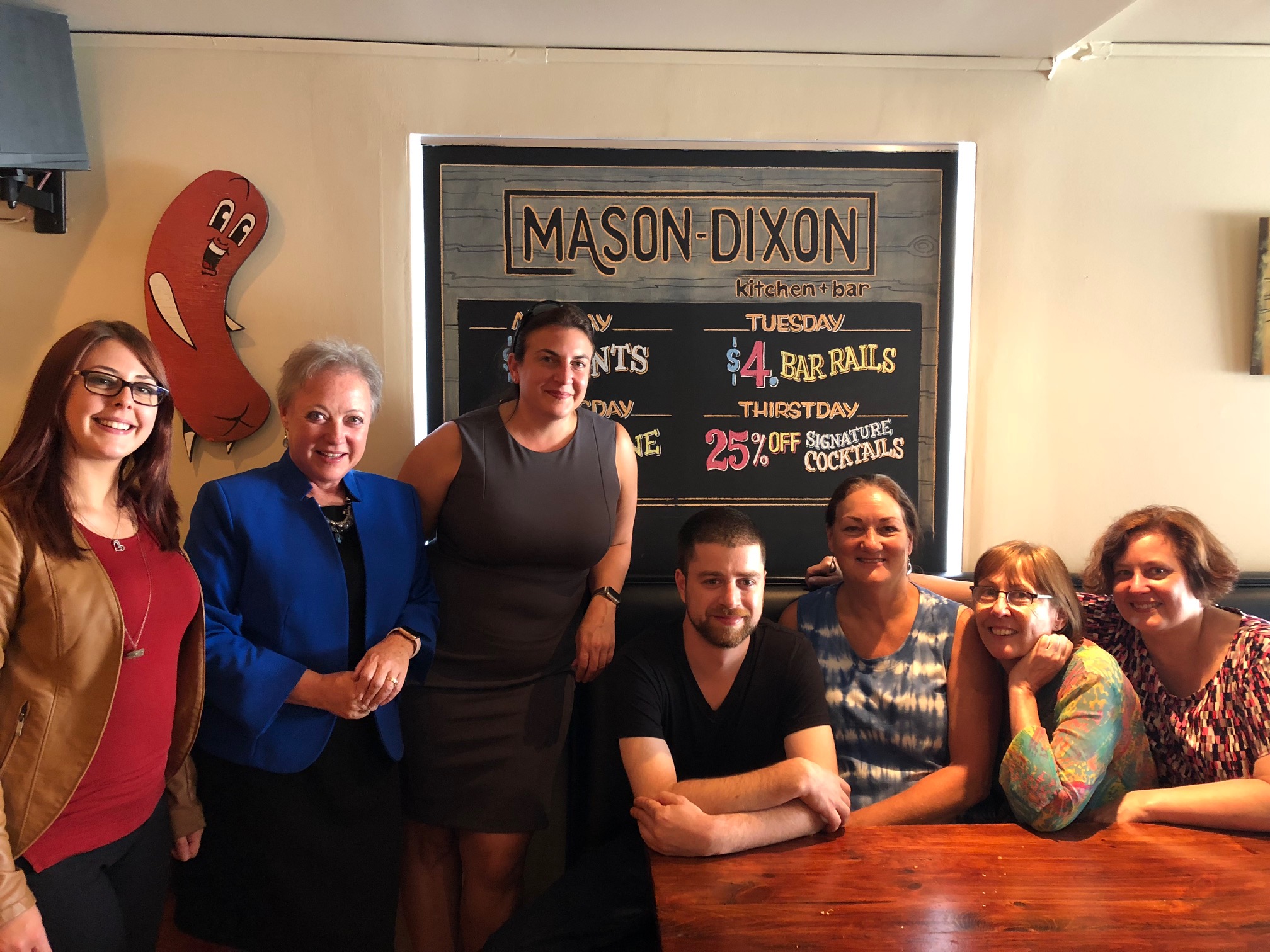 To celebrate Clementine’s birthday our team decided to have lunch at a newer restaurant called Mason-Dixon Kitchen + Bar. This quaint restaurant, located on Preston Street, features southern smokehouse cuisine. We could smell the mouthwatering aromas of smoked meats as we walked up to the entrance. Inside, the restaurant is filled with unique and fun artwork of personified condiments and meats, and has a warm and welcoming atmosphere.