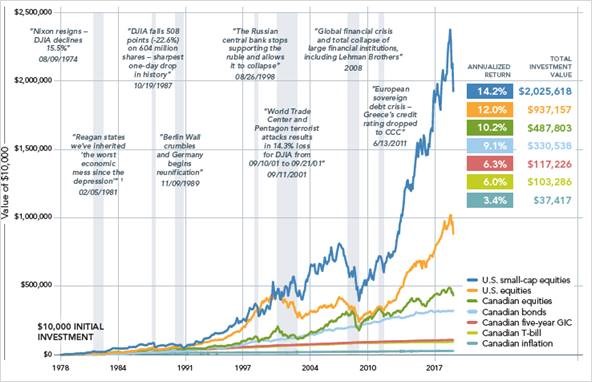 Many events have affected markets in the past; however, over the long term, markets have historically bounced back. Investors who stayed the course increased their wealth — and as you can see, the longer they stayed invested, the better: