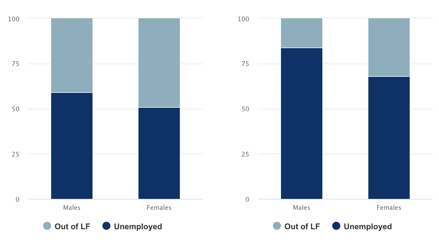 Alongside the higher unemployment rate, an alarming trend has begun to surface: women are more likely than men to “fall out” of the labour force. Half of newly unemployed women who lost their jobs between February and May (and 32% between February and June) were terminated and were not actively seeking work. Men, on the other hand, were more likely to be actively seeking new jobs.