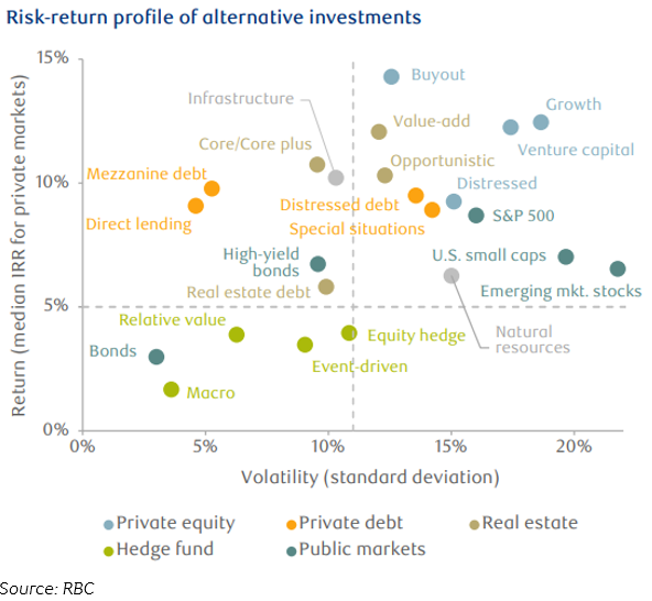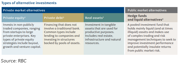 The Pamela Yoon Group recognizes the strategic benefits of incorporating both return-enhancing and risk-mitigating alternative investments into client portfolios. In collaboration with RBC Wealth Management’s dedicated Alternatives Investment Team, we thoroughly vet each opportunity before integrating it into investment strategies. This blog serves as an introductory guide to our perspective on alternative investments.