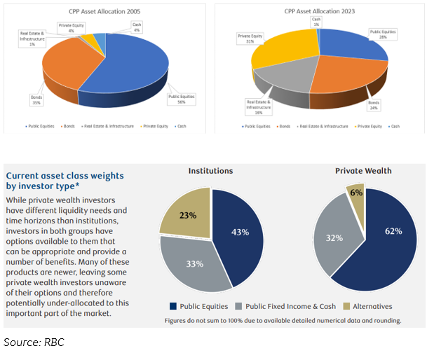 Institutional investors have been increasing their allocation to alternative investments for years. Given their less liquid nature, a long investment horizon is essential. Individual investors should carefully assess their cash flow needs to ensure appropriate portfolio liquidity before investing in certain alternatives. The Canada Pension Plan’s asset allocation over the past 18 years exemplifies this shift to include more alternative investments in its portfolio. In 2005, over 90% of its investments were in traditional asset classes, but today, private market investments represent a significant portion of its portfolio as can be seen below.