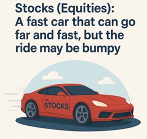 Stocks (Equities): A fast car that can go far and fast, but the ride may be bumpy.