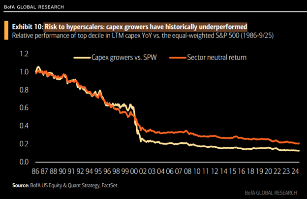 Is this going to end up the same as the dot-com boom? Time will tell. It's too early to identify the most successful companies, and we'll eventually see "winners" and "losers." The question is whether the current enthusiasm is justified. The surge in AI investments mirrors the late 1990s dot-com boom, with capital pouring into infrastructure and tech hardware at an unprecedented scale. Some investor caution is warranted as the US market's largest stocks transition from asset light to asset heavy business models, supported by that rapidly growing capex. Historically, capex growers have dramatically underperformed the market…