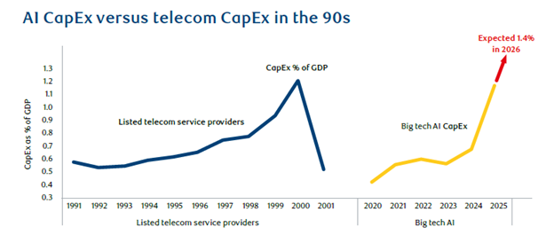 AI has clear echoes of past capital cycles, including the fastest capex ramp in history, speculative spending on data centers built ahead of steady revenue models, GPU shortages creating a false sense of scarcity that results in overordering, and an unclear determination of return on investment as the cost of inference rapidly declines. If forecasts of AI use prove overly optimistic, the capex boom may have lasting consequences for the market.
