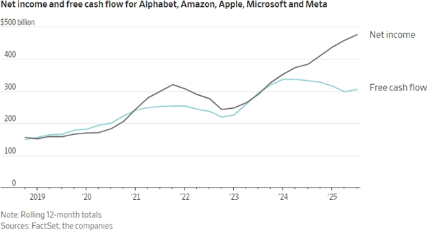 AI cash flow is what matters… you can’t hide from cash flow like you can earnings. There’s one key difference between the AI players of today and the dot-com names of two decades ago – the leaders of this market are making plenty of money. But all the AI spending is starting to take a toll: The 12-month cumulative cash flow for Meta, Alphabet, Microsoft, Apple and Amazon has dropped in the past few years.