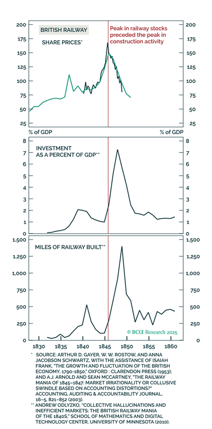 Jim Bianco sees may similarities to the internet boom: “Here’s the problem: every AI company is priced as if it’s going to win, which is reminiscent of the dotcom bubble in the late 1990s. Back then, every internet company was priced as if it was going to win. Yes, the internet was important. It mattered, and there were huge winners, but not everybody won. The issue is everybody looks at their deal to build a data center. On paper, it all makes sense, the economics work. But the problem is there are dozens of other people making the exact same decision, all at the same time, and collectively this leads to a massive overbuilding. Excesses like these are a recurring theme throughout history, from the major railway bubble 150 years ago (roughly 70% to 80% of the trackage added in the 1880s entered receivership by 1900) to the fiber-optic buildout during the dot-com mania (enough fiber to circle Earth 4,000 times). Every time, so much infrastructure was constructed that a portion of it was never even utilized.”