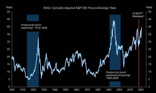 There was a recent MIT study suggesting most companies aren’t yet seeing a meaningful impact to their bottom line from AI unsurprisingly – this technology will take time to integrate and monetize. I would generally agree with the view of NY Fed President John Williams, which he articulated in a speech to the financial community in September in NYC, that AI may end up being a chapter in a longer-term story about American productivity, and will likely take some time – similar to other general-use technologies – to have a meaningful impact on productivity.