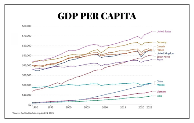 At the heart of U.S. economic exceptionalism is the unwavering rule of law and rock-solid structure of the U.S. government. Put plainly, global investors buy U.S. assets and come to the U.S. to innovate because 1) They know the rules (the court system is well established and broadly viewed as impartial) and 2) These rules don’t change based on the latest elections or on which power is in control in Washington. Compare that statement to China (their next closest economic competitor) where neither the courts nor the structure of government is safe from whoever is in power. Trump’s attacks on Fed Chair Jerome Powell erode this idea of solid structure of the government and as such, erode the idea of American economic exceptionalism.