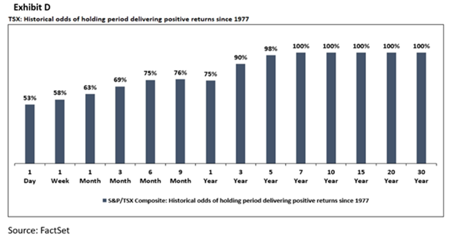We have to remember that investors often fixate on the short-term risks and engulf themselves with headlines that portray an image of maximum discomfort. We focus on the now, we feel like we have control in the now. In contrast, short term volatility tends to compare to detours on a scenic drive, with a long-term perspective providing comfort to ongoing dismay. This chart shows that historically the odds of experiencing a positive return drastically increases with longer holding periods. In summary, time and patience remains the greatest asset. You can see that even if you hold just TSX stocks (not a recommended portfolio!), you haven’t lost money in any period since 1977 if you held 5 years or longer: