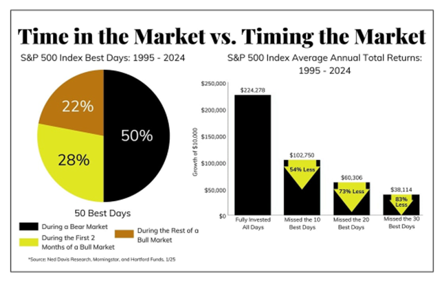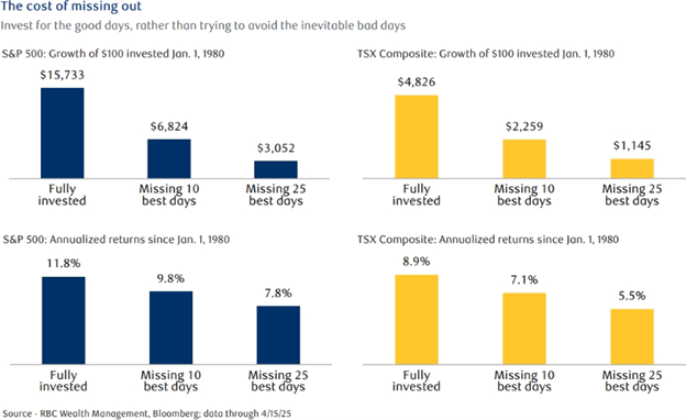 The market noise is unnerving, but the holy grail lies in positioning well for one’s risk appetite, and preserving capital during volatile times. The natural reaction for many is to react, to sell, and to attempt to avoid and protect from further decline. Any investor who is worth his/her salt knows that short-term timing the market is a fool’s errand, and the chart below reiterates why. Of the 50 best days in the market over the past 30 years, 50% of them occurred during a bear market (like we saw some of in April, for example). If one were to have missed just 10 of those days, returns declined by a stunning 54%! Missing the top 20 cost investors losing 73% of their return and missing the top 30 days led to returns 83% lower than long-term averages. Higher long-term returns can only be achieved with both good AND bad markets – you can’t have one without the other. This isn’t to say that portfolios shouldn’t be actively managed, tactically positioned and capital preserved during volatile periods. It’s just a simple reminder that it’s not about ‘Timing the Market’ but ‘Time in the Market’. While it might be tempting to precisely time the market peaks (sell at the top) and troughs (re-entry at the bottom), the probability of doing so across multiple cycles is likely to be extremely low. The more suitable approach is to stay disciplined and invested, which can help keep investors on the trajectory towards achieving their long-term financial objectives. For those that commit to a plan, less anxiety awaits, and goals planned for get achieved.
